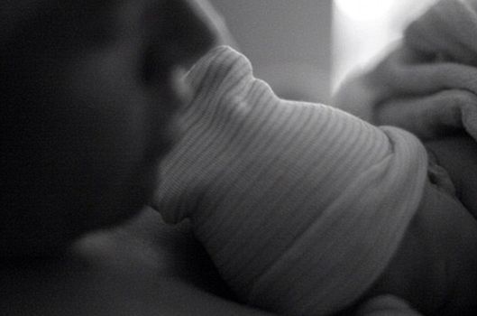 The snapshot shows Busy blurred in the background with a sneak peek of her newborn resting on her chest.