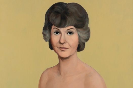 “I had a vision in my head of Bea Arthur, and I found a picture of her. I was going to put a scarf ensemble on her like that from her Maude days, and I drew the body just to drape it. It was then that I realized that the painting was fantastic as it was,” Currin said. “I loved being repelled by those two black eyes and falling back into these wonderful, soft breasts, which draw you back in.”