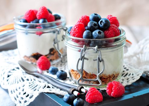 Blueberry and banana breakfast overnight oatmeal in a mason jar, with checkered cloth on wood