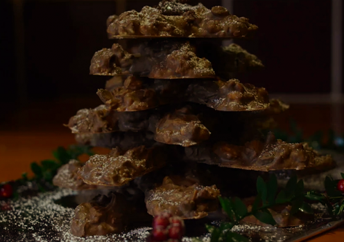 Spoon the chocolate mixture onto the crosses and leave them to harden. Once it has completely set, you can begin to stack the branches at alternate angles using some melted chocolate as your glue to hold everything in place. Once the tree is complete, you can shake some icing sugar over it to resemble snow. Serve on a decorative platter, maybe with a few tea lights around the base.