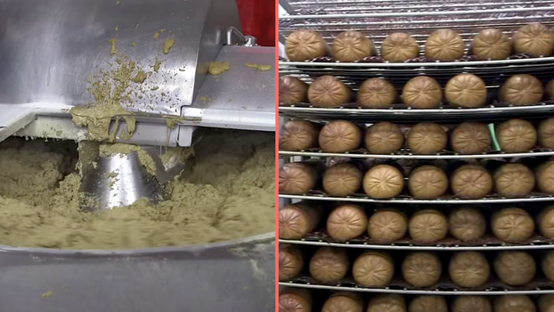 The process first involves four people making the dough of tofu and wheat, known as ‘masa’, which is mixed with canola oil, water and savory seasonings.