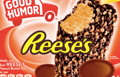 “Made with Real REESE’S Peanut Butter Swirl! Frozen dessert bar blended with REESE’S peanut butter sauce and covered in signature Good Humor cake coating. A perfect combination of flavours, peanut butter and chocolatey goodness in every bite,” reads the description.