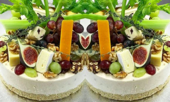 Yes, this beautiful cake comes topped with grapes, cheese, walnuts, and cranberries – and it has a cream cracker base with a spiced apple and pear chutney filling. Certainly different, but we reckon equally appealing.