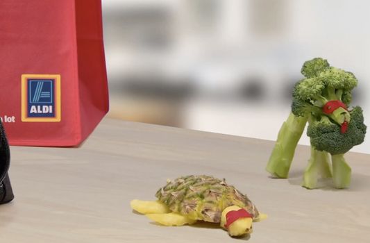 Well, they are super foods! Aldi’s cute new video shows a group of superhero characters made from a cucumber, an orange, an apple, a kiwi, broccoli and a pineapple that are trying to escape from a shopping bag.