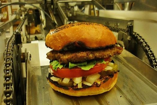 “The Burgeon can crank out a burger every 16 seconds. It grinds the meat, stamps out the patty, sends it along a conveyor-belt grill, toasts the buns, squirts on the condiments, slices and drops in pickles and tomatoes and lettuce, then pops the finished burger into a bag, all in under five minutes,” reports The Mercury News who’ve seen the robot in action.