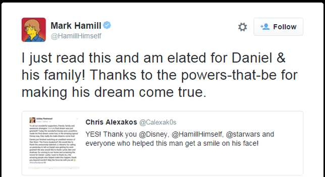 YES! Thank you @Disney, @HamillHimself, @starwars and everyone who helped this man get a smile on his face! pic.twitter.com/mWrF1xqqbY