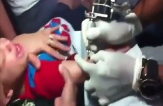 The video, which has gone viral, shows a little boy no more than three-years-old being pinned down by his mother and the tattoo artist as he shouts out in pain for them to stop.