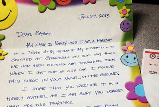 The woman who wrote the letter, Nancy, had found Sarah’s paycheck as herself and her husband stopped in Starbucks for a coffee on their way back from visiting their daughter.