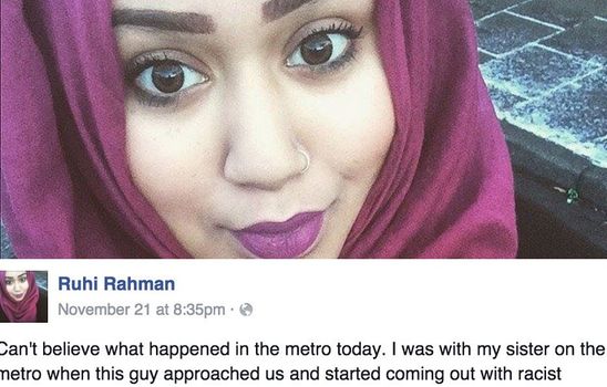 Ruhi Rahman was sitting on the Tyne and Wear Metro when a man started making racially abusive and threatening comments against her and her sister.