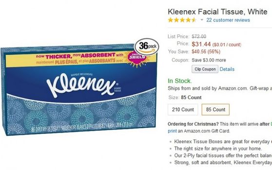The other day my husband was watching me unload the groceries, and he asks me, all sweetness and light, “Honey, what’re you doing with all that Kleenex?”