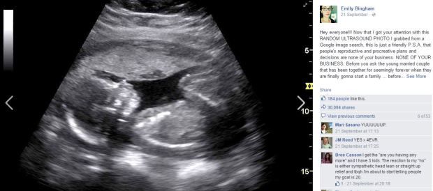 Posting a random ultrasound photo she found on google to grab people’s attention, Emily penned a long and heartfelt post about fertility issues and social norms.