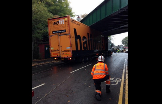 A Halfords lorry, with the slogan “We Fit” emblazoned across its back doors, became stuck under a bridge in Beckenham after the driver approached the low crossing without checking height restrictions.