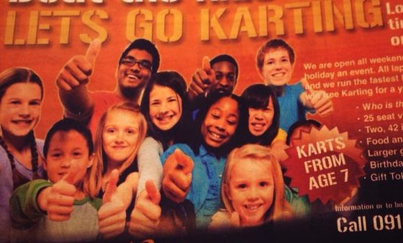We know where they were going with this idea but it just didn’t pan out the way they expected. “Beat the Kids this Weekend” is the tag line for the Galway City Karting advert.