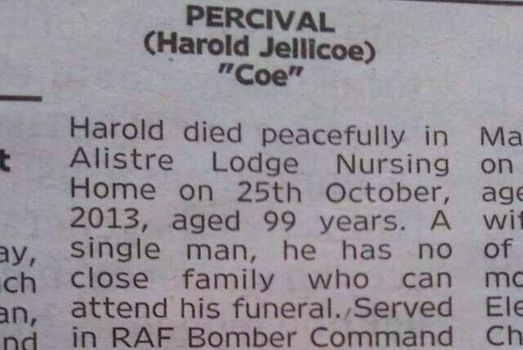 This particular obituary was posted to Imgur and is having quite a dramatic effect. Harold, or “Coe”, was a World War II veteran who died with no close family.