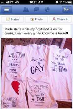One besotted young woman allegedly created these t-shirts before her suitor headed off on a cruise, solo. Class act.