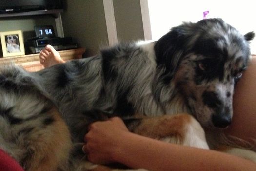 The woman in the pictures is 8 months pregnant. Her husband posted this picture of their dog in his favourite spot for the last three months.