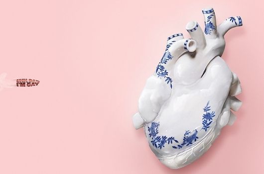 The advert shows a bullet which is labelled “Uhh Dad, I’m Gay” which is heading for a porcelain heart against a pink background. The caption reads “You need a strong heart today”.