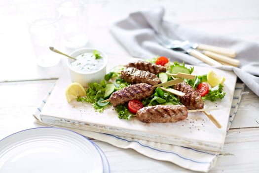 - Serve the cooked lamb skewers with the yoghurt dip and crispy salad.