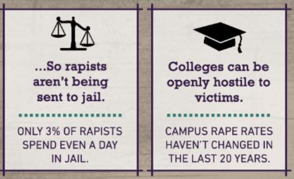 The first box on the infographic highlights fear. Many people who are sexually assaulted are too afraid to report the incident. The statistic shows that less than half of rapes are reported.