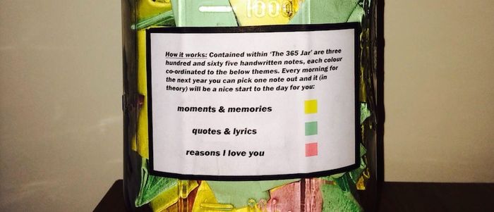 This young gentleman searched high and low for a Pinterest-favourite Mason jar, one large enough to hold 365 special notes.