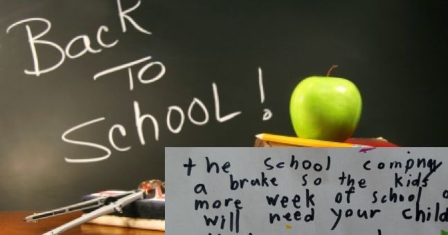 She wrote: “The school compnay is taking a brake so the kids will get one more week of school off and we will need your child to sign their name here.”