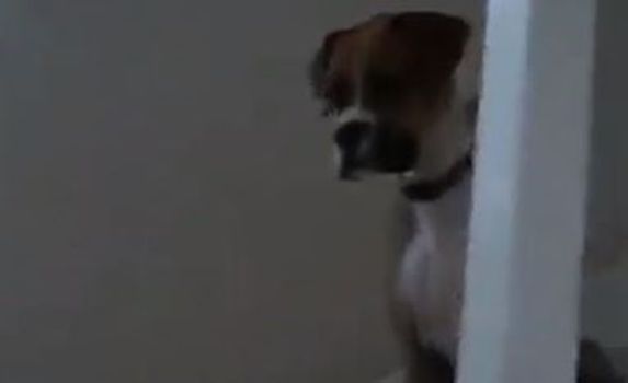 He was so afraid of his feline friend that he couldn’t get down the stairs no matter how much his owners tried to coax him down.