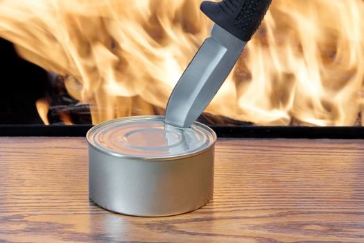 Posted on YouTube by user diasterprepper, this video showcases a method of opening the tin by simply rubbing on a concrete surface, no hacking with a kitchen knife required.