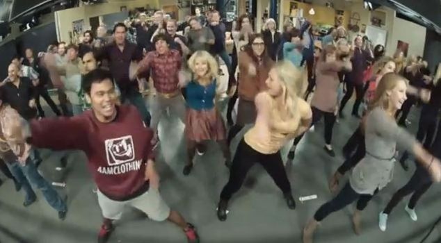The cast of the hit comedy prove that they are just as much fun off screen as they are on it with their flash mob...