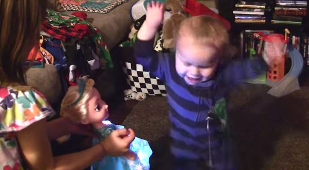 However, her brother Jackson is also obsessed with Let It Go and he can’t help but get his groove on when the doll sings his favourite tune.
