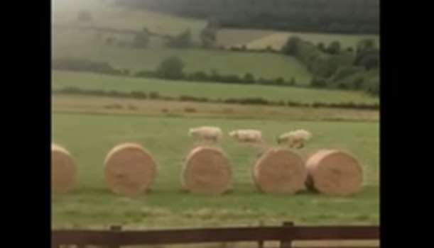 The clip shows lambs in a field making the most out of their time in the open space by using the bales of hay as an obstacle course… and we love it.