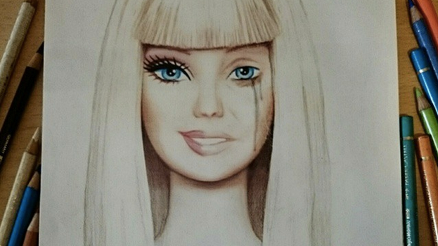 Gibson pencilled a striking image that depicts a Barbie doll with half of her face free from makeup and the message ‘We All Wear A Mask’.