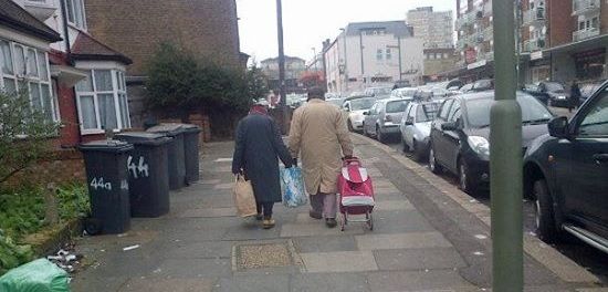 It shows an elderly couple returning home from doing their shopping and they’re holding the bag between them to share the load.