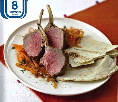 Meanwhile, mix together the carrots, mint, orange juice, vinegar and seasoning in a bowl. Serve one lamb rack and a quarter of the carrot salad per person.
