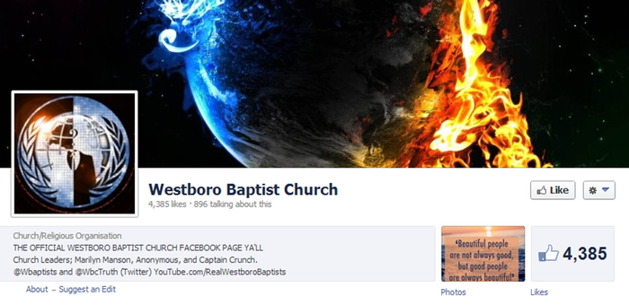 Westboro Baptist Church is known for having controversial views. You might remember The Rubberbandits replied to one of their tweets recently. Well the band is not alone as Anonymous have decided to hit back as well by hacking their Facebook page.