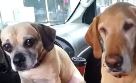 Anyway, that’s enough about our laughter, this video shows two dogs in the car with their owner who took them to get an ice cream.