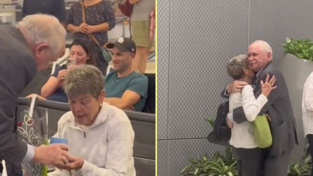 A 78-year-old man has melted the hearts of millions after proposing to his childhood sweetheart at the airport.