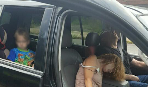 Images of a couple strung out on heroin while a child watches from the back seat of a car have gone viral.
