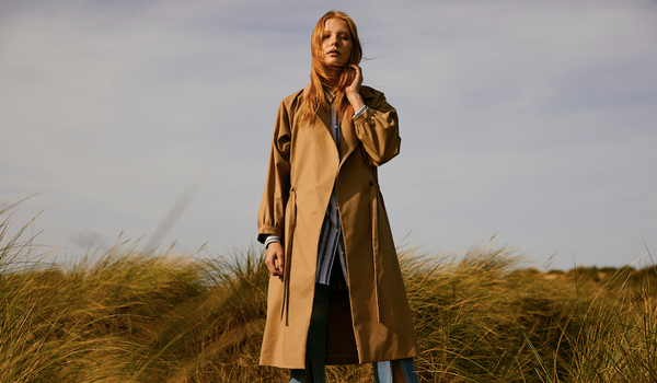 Denim is a strong trend in the new collection with one bold double-denim look. There’s also pops of bold colour, mainly green, red and pink and the tan trench and wine coat, pictured below, are stand-out pieces.
