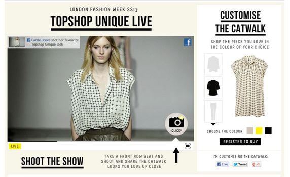 Features include “Customise the Catwalk” allowing viewers to change the colour of certain items as they come down the runway and a “Shoot the Show” function so you can pretend to be a fashion photographer, virtually snapping the looks as they appear which are then shared on your Facebook page.
